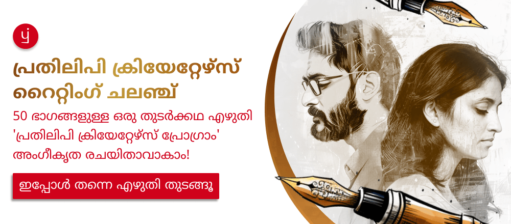 പ്രതിലിപി ക്രിയേറ്റേഴ്സ് ട്രെയിനിംഗ് പ്രോഗ്രാമിന്റെ ഭാഗമായി പ്രതിലിപി ആരംഭിക്കുന്നു 'പ്രതിലിപി ക്രിയേറ്റേഴ്സ് റൈറ്റിംഗ് ചലഞ്ച്'. എക്സ്ക്ലൂസീവ് 'പ്രതിലിപി ക്രിയേറ്റേഴ്സ് പ്രോഗ്രാം വർക്ക്ഷോപ്പ്' സർട്ടിഫിക്കറ്റും മറ്റ് നേട്ടങ്ങളും സ്വന്തമാക്കാൻ നിങ്ങൾ ചെയ്യേണ്ടത് നൽകിയിരിക്കുന്ന സമയപരിധിക്കുള്ളിൽ നിബന്ധനകളെല്ലാം പാലിച്ചുകൊണ്ട് ഈ റൈറ്റിംഗ് ചലഞ്ചിൽ കുറഞ്ഞത് 50 പുതിയ ഭാഗങ്ങൾ എഴുതി പ്രസിദ്ധീകരിക്കുകയാണ്.