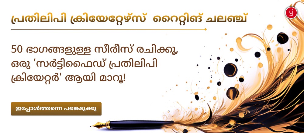 പ്രതിലിപി ക്രിയേറ്റേഴ്‌സ് പ്രോഗ്രാം റൈറ്റിങ് ചലഞ്ചിൽ പങ്കെടുക്കൂ. ഈ ചലഞ്ച് രചയിതാക്കൾക്ക് അവരുടെ കഴിവിനെ പരിപോഷിപ്പിക്കാനും, വളർച്ച സാധ്യതകളെ കണ്ടെത്താനുമുള്ളതാണ്.